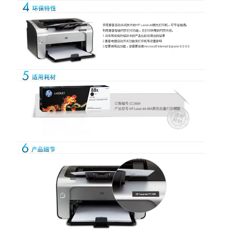 參數(shù) [商品名稱] 惠普(HP)P1108 [最大支持幅面] A4 [打印速度] 18頁/分 [品牌] 惠普(HP) [型號(hào)] P1108